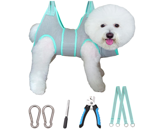 I love the stability this harness gives the pups on my table. It’s versatile and comfortably supports them by the lower chest and not around their neck.